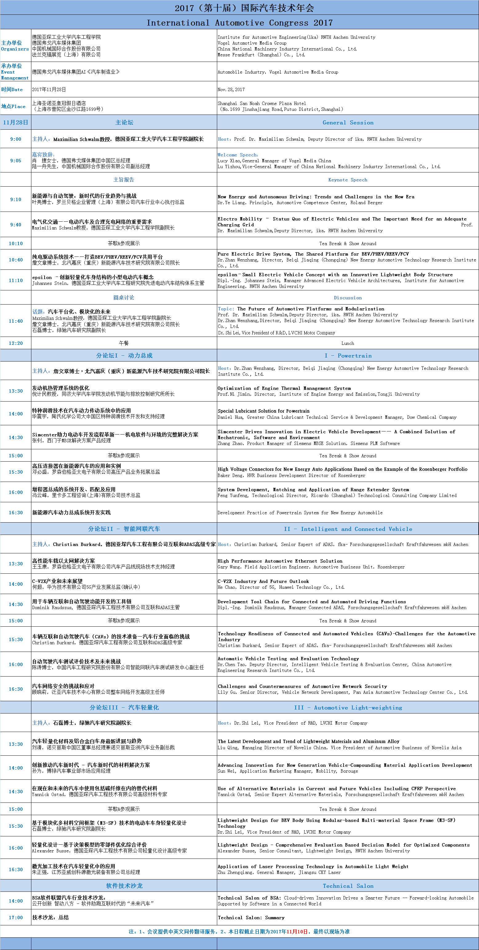 今年的演讲专家将会有来自德国亚琛工业大学汽车工程学院、德国亚琛汽车工程技术有限公司、北汽新能源、绿驰汽车科技、泛亚技术中心、里卡多、中国汽车工程研究院、西门子工业软件、罗森伯格、诺贝丽斯、博禄、陶氏化学的技术专家,就汽车领域的前沿技术和创新项目进行深入探讨,分享他们各自领域的前沿技术成果。
