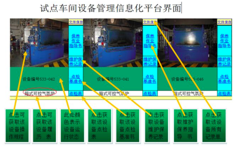 设备各项信息反馈滞后,设备相关人员不能及时掌握设备的运行状态,设备各项资料都是单份纸质存放,不能多 人随时共享。设备的维护保养计划及作业指导书、设备操作规程、设备日常点检表及点检基准书、设备档案、各项记 录等资料都是通过纸质存档,资料存放需要专人管里,查找费时耗力。现在借助信息化平台设备运行状态界面上可以 通过不同的颜色来表示设备的运行状态(绿色表示设备正常运行、蓝色表示正常停机、橙色表示带故障运行、红色表 示故障停机),这样所有设备相关方都可以很快地通过网络信息掌握设备运行状态。通过信息化平台设备维护保养计 划及作业指导书、设备操作指导书、设备日常点检表及点检基准书、设备档案、各项记录等资料都可以一键获取随时 查阅。具体从试点车间设备管理信息化平台上获取相关信息的操作界面如下: