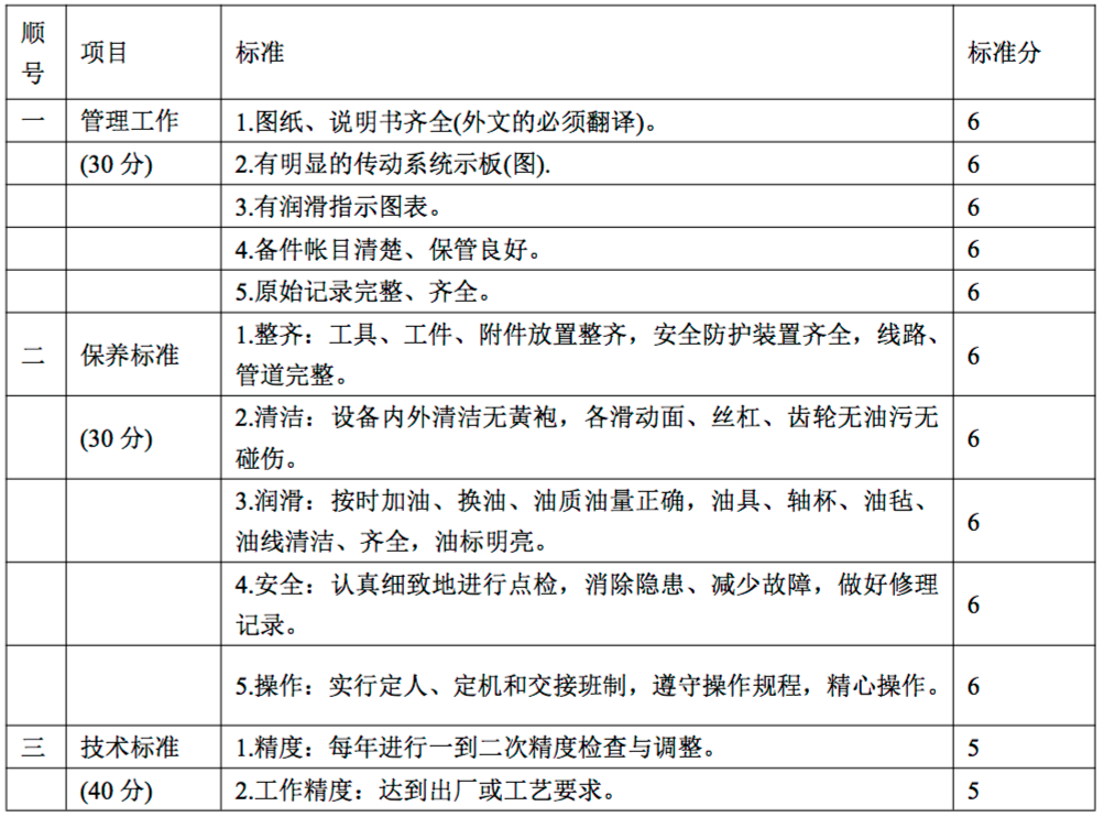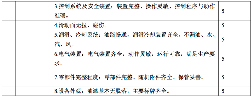 4. 根据设备在生产流程中的地位及设备本身的复杂程度,资产部每月对承包的设备保养状态和技术状态进行检查打分,公司把车间承包设备达标情况作为车间评优考核条件进行考核。