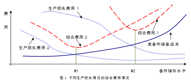 降低备件库存水平的同时保证设备维修,一直是一个"鱼和熊掌能否兼得"的话题,但企业往往很难把握备件储存水平与设备停机损失的矛盾关系:一方面要减少设备停机后维修时等待备件时间,一方面要减少备件储存水平;一方面要维修成本最小化,一方面要生产损失最小化。怎样权衡?下面通过图1说明这个问题。