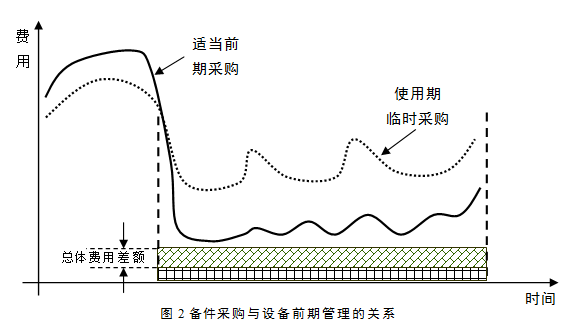 在设备的前期管理阶段,即设备选型时应充分考虑性价比和系统成本,特别是备件的选择应能够使设备寿命周期费用最经济;同时,应充分利用买方市场的优势地位,在设备整机订购时考虑易损备件供应、制造工艺参数,积极要求设备制造商同时提供备件图纸和技术指标等。很多案例得出的经验表明:在设备采购的同时适当采购关键备件和易损备件储备,其总体费用要远低于在设备使用过程中,因设备维修临时采购备件,两种方式的总体费用比较如图2所示。